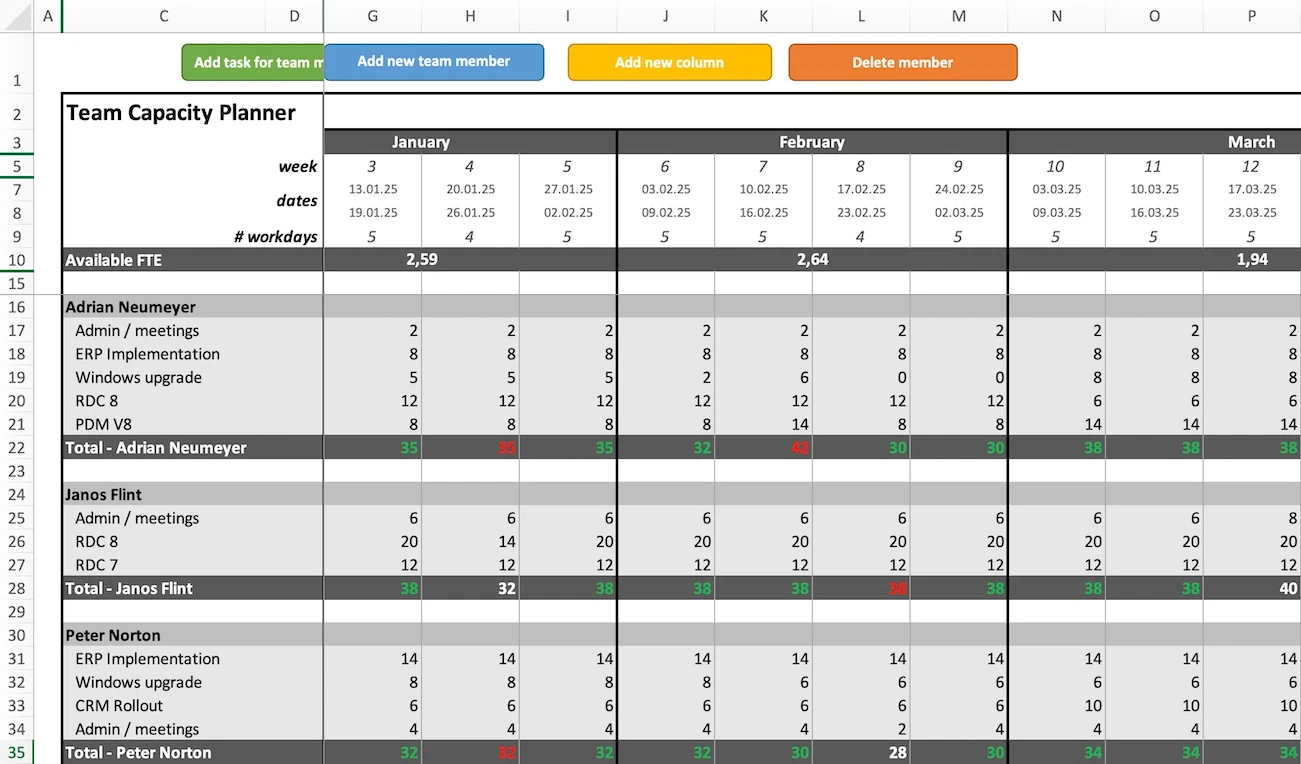 Plan work, track allocations and spot overload — all in a clear Excel sheet.